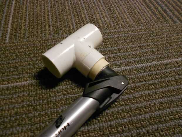 Si su salida de la bomba no es circular o es demasiado ancha, usted puede conseguir una longitud de 1"(3 cm) del cuerpo de la pluma de plástico o un poco de metal tubular estrecho que es aproximadamente el mismo diámetro que una válvula de bicicleta (o una válvula de bicicleta, supongo). Todo hueco que encaja en la bomba es buena. Simplemente Envuelva la cinta alrededor de eso en vez de la bomba y conecta a la bomba. Todo lo que necesitamos aquí es para que conectar a la cámara de presión a través de la Unión en T de la bomba. Si la bomba coincide con el diámetro exterior de la Unión en T, podría salirse con simplemente cinta adhesiva la Unión en T de la bomba. Irá en la apertura media del T.