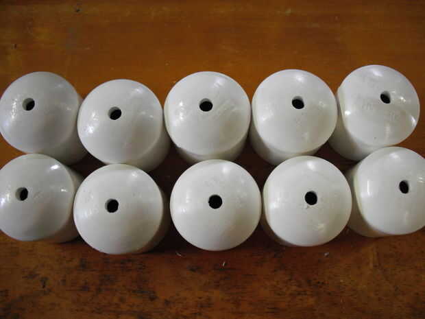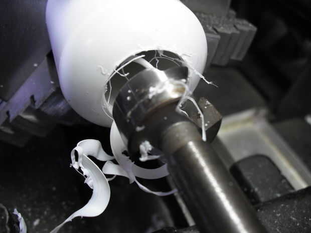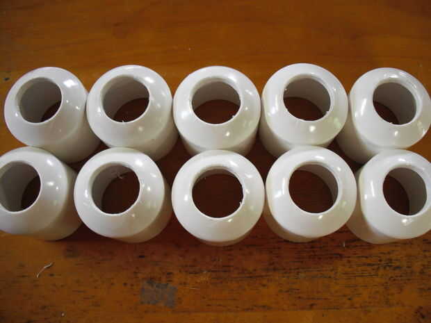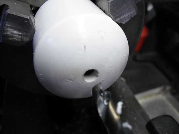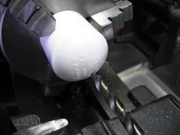 La boquilla está hecha de uno de los casquillos de extremo de PVC de 1". Con el cuento de stock y lugar mandril un orificio de 1/4" en la tapa del taladro. Con la pieza en el mandril saque cualquier bastidor marca la cara de la boquilla con un archivo.