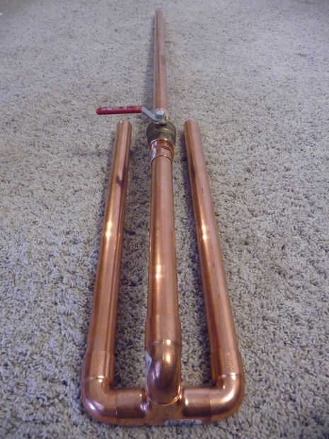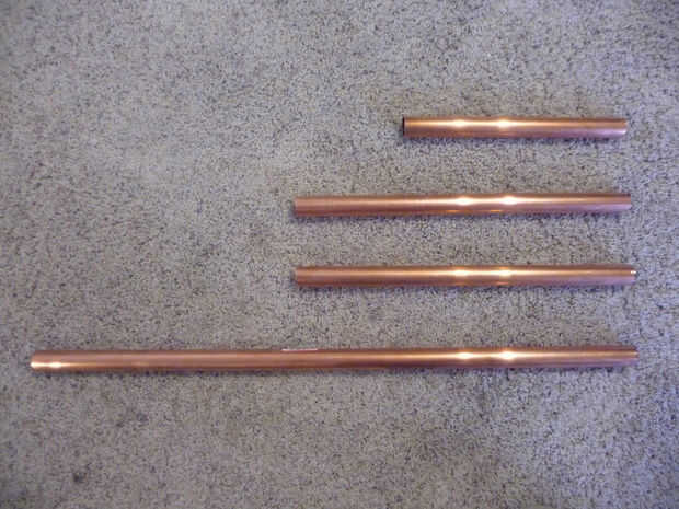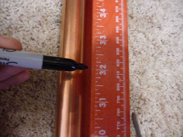 Se corta la tubería de 10 pies en cuatro secciones. Uno de 32 pulgadas de largo, dos de 20 pulgadas y un cuarto de 12 pulgadas. Marque cada distancia con un rotulador alrededor del tubo y cortar con una sierra para metales o cortatubos si los tienes disponibles. Es más fácil cortar el metal exterior, en lugar de perpendicular en un corte.