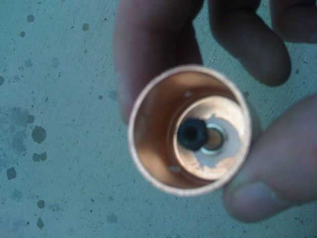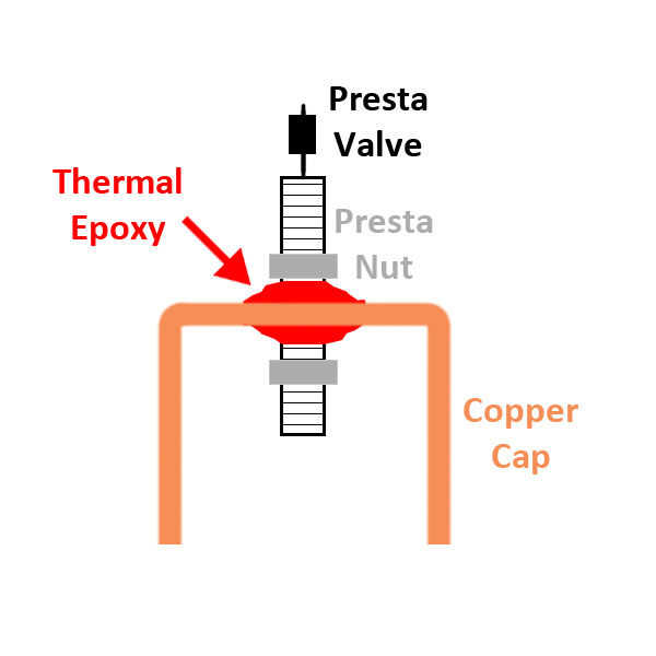 Para hacer el sello, obtener una válvula Presta roscada y dos tuercas (que pueden requerir un segundo tubo de repuesto). Corte en gran parte de la goma, y la primera tuerca sobre 2/3rds hasta la base de la válvula. Presione la válvula a través de la tapa y enrosque la segunda tuerca, pero no completamente. Cuidadosamente aplicar el epoxi termal para el cobre por debajo de cada tuerca y apriete ambas abajo con los alicates. Por último, aplicar epoxi encima de dos tuercas y dejar curar durante treinta minutos a una hora.