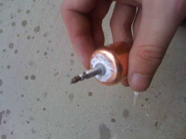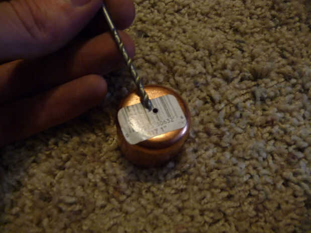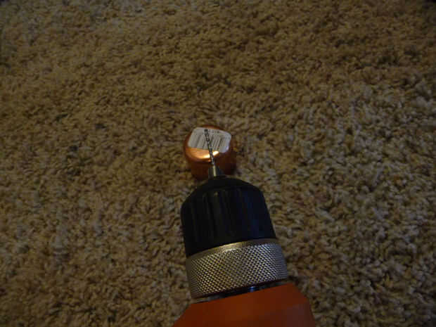 Comenzar con un pequeño 1/16 pedacito de taladro, perfore un pequeño agujero en el centro de la tapa. Poco a poco progreso hasta en tamaños de brocas de 1/4". En 1/4", la válvula Presta no caben, así que moler lejos con el lado de la broca hasta que lo haga. Queremos una abertura tan estrecha como sea posible, idealmente, debería requerir un mono real fisting para empujar la válvula a través de.