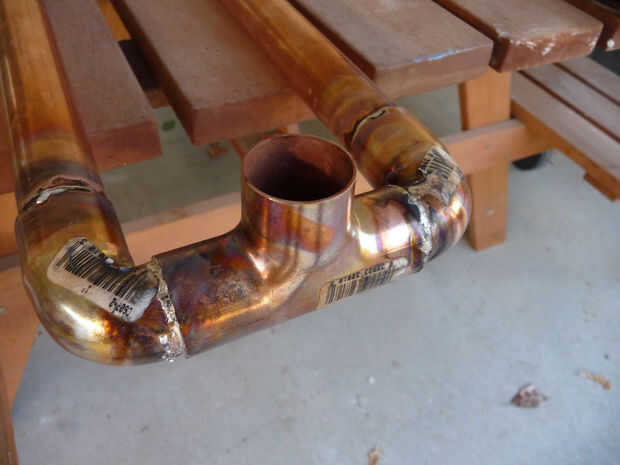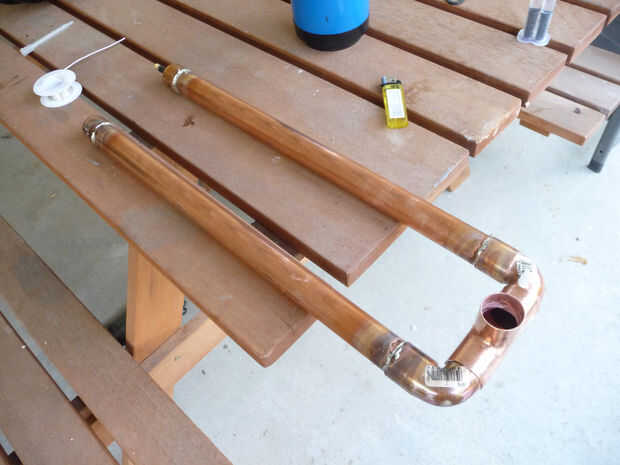 Esta parte requiere un poco más de precisión, soldadura nuestro casquillo de entrada a su cámara de 20". El epoxi no está diseñado para tomar temperaturas sobre 200 F, sin embargo estamos calentar el cobre a alrededor de 600 F. aplicar la mayoría de su calor en la coyuntura donde el tapón con el tubo. Justo intentar reducir al mínimo exceso calefacción cerca del extremo de la tapa. Deje que se enfríe el tubo 10-15 minutos antes de comenzar la siguiente prueba.