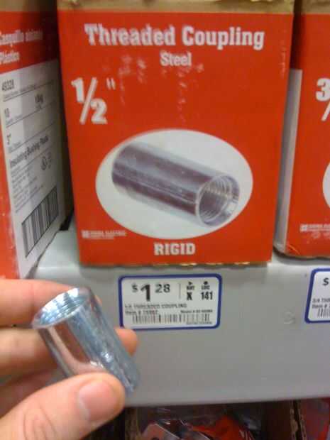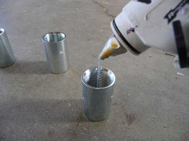 Usted puede encontrarlos en la sección de la pipa eléctrica en Lowes, de $1,28 por acoplamiento. Aunque se fabrican para tubos de 1/2", las paredes de metal son tan gruesas que es casi exactamente 1" diámetro. Pegamento caliente palos son baratos, y llenando la ronda, nos hacen más pesados, más durable y capaz de atrapar aire. Esto añade peso extra (fuerza), y usted se sorprenderá en el pegamento caliente como indestructible puede ser. Para rellenar las babosas, simplemente poner un acoplamiento vertical en cemento o concreto y empezar a verter en el pegamento caliente. Deje que se seque, y tendrá una superficie dura, plana y frontal. Los hilos de rosca en el acoplamiento aseguran que el pegamento es imposible arrancar.