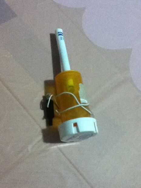 Paso a paso sobre cómo hacer una pistola de papa rosa mini. Es lindo y funciona!Paso 1: Reunir los materialesBotella de la medicina, botella de agua, encendedor/sparker, pluma tubo, pistola de pegamento, cinta colorida hockey, lacaPaso 2: PerforarPer