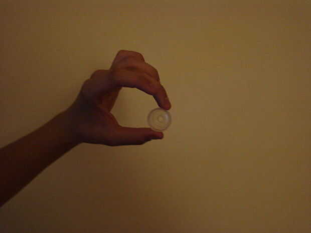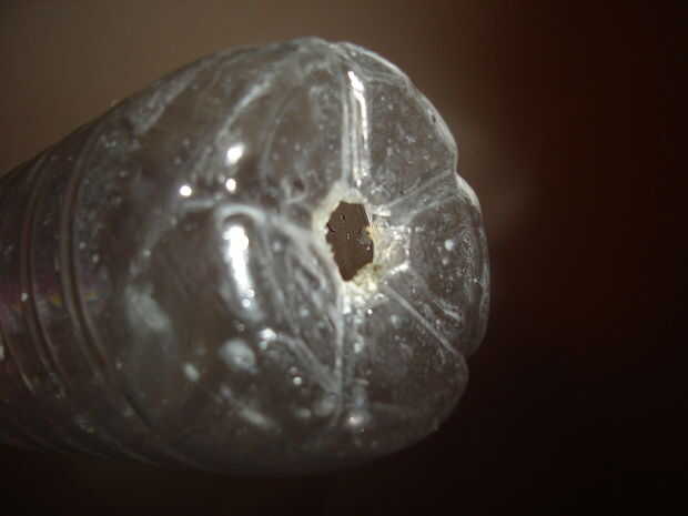 Para preparar la botella, todo lo que necesitas hacer es perfore un orificio a través del centro de las chapas (esto puede necesitar ser ajustado en el paso siguiente) y luego taladrar un círculo en la parte inferior de la botella así que usted puede caber una cabeza más clara de seguridad a través de él muy bien. Es muy importante que el encendedor se ajusta perfectamente, si no, existe la posibilidad de fuego disparando hacia la parte posterior y te quema.