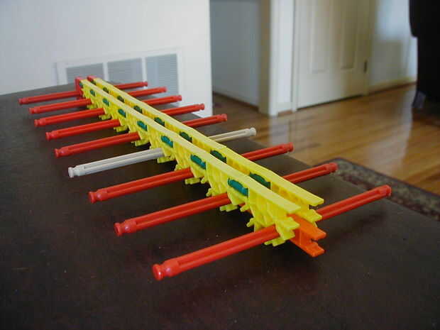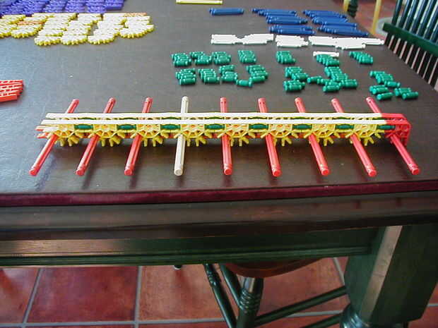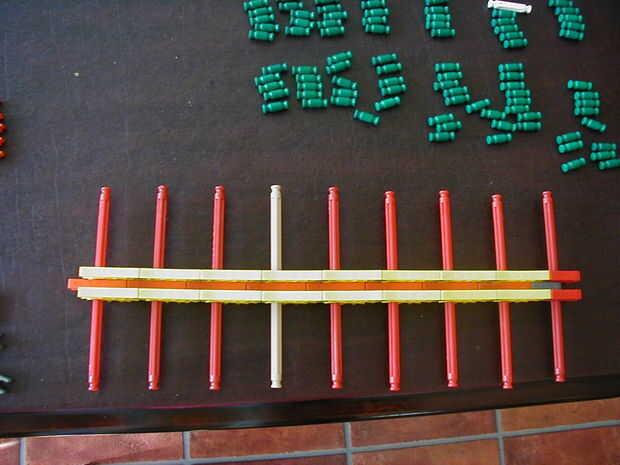Piezas necesarias: barras rojas: 9 barras verdes: 24 conectores gris oscuros: 1 conectores naranja: 8 conectores rojo: 2 conectores amarillo: 16