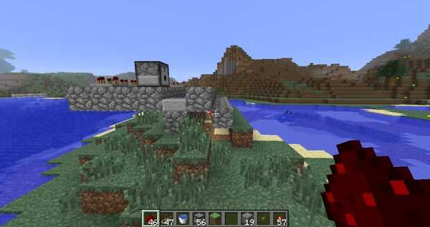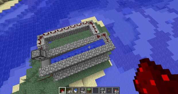 Poner agua en el extremo opuesto de la losa. Luego ir al lado del cañón enfrente del c en forma de estructura y construir un muro de una cuadra de los depósitos bajo el cañón y la misma altura que ellos. Luego poner antorchas en cada bloque al lado de un depósito en el lado hacia el cañón. Refiera a los cuadros.