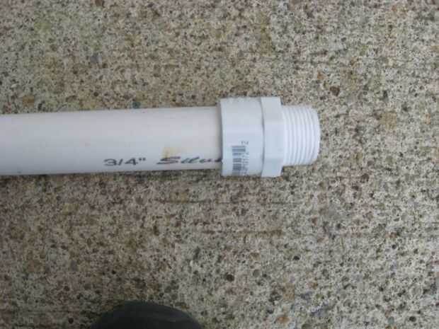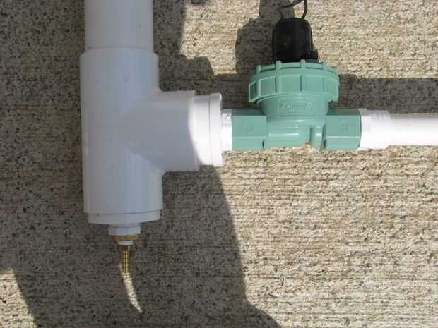 En primer lugar, coloque una hoja de 3/4 de pulgada a 3/4 pulgada roscada en una pulgada 2 a montaje de reductor de 3/4 de pulgada. Utilice cinta de plomero para envolver los hilos y luego inserte un extremo de la válvula del aspersor (Asegúrese de seguir las flechas en la válvula del aspersor). A continuación, conecte otro resbalón 3/4 de pulgada a 3/4 pulgada de rosca en una longitud de tubería de 3/4 de pulgada PVC (mi pipa era 2 pies de largo). Envuelva estos hilos en la cinta de plomero y luego inserte en el otro lado de la válvula del aspersor. Asegúrese de que ambos lados de la válvula del aspersor son apretados. Finalmente, coloque el mecanismo de liberación de aire en el tubo de la compresión.