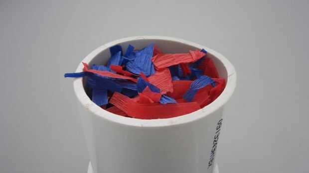 Ahora llenan el cañón confeti. Yo prefiero usar confeti de papel ligero porque se extiende muy bien y flota alrededor en el aire por un tiempo. Pero también se pueden utilizar otros materiales. Si vas a una boda, usted puede rellenar con arroz, pedales de flor o semilla del pájaro. Para materiales más pesados, recomiendo usar un barril más estrecho con un tanque más grande.