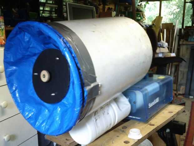 Este cañón vórtice fue construido como un efecto de Halloween, quería que ser llenado por lo tanto, la máquina de humo conectada. Envía anillos de humo de larga distancia.