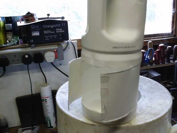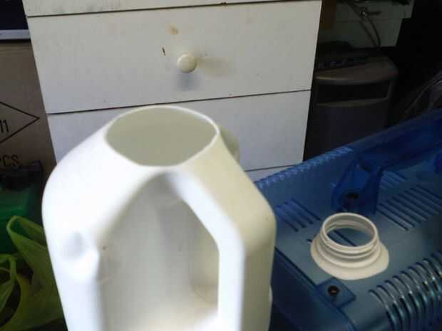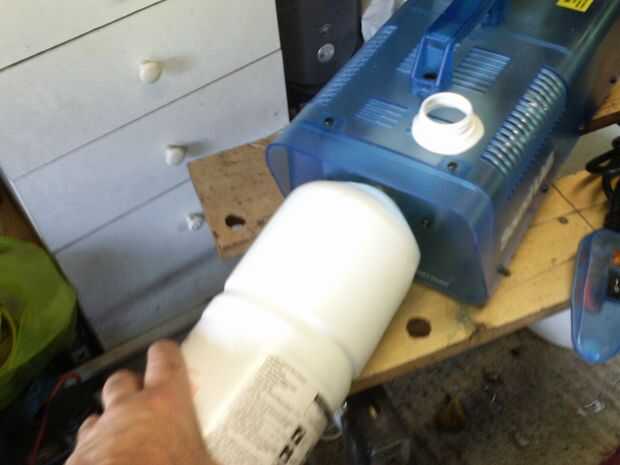 Con un cuchillo afilado cortar el cuello de la botella de lejía, el agujero para ser un buen ajuste en el anillo de plástico alrededor de la salida de humos de la máquina de humo.