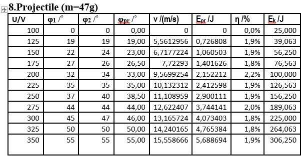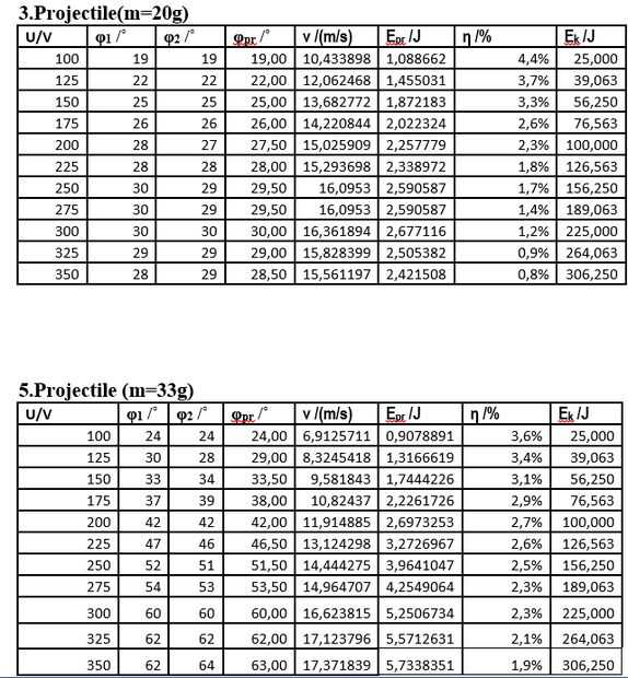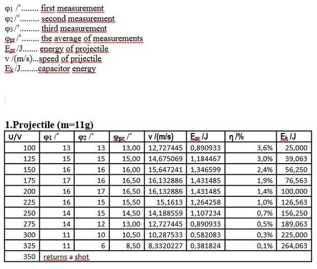 En segunda medida, queríamos determinar cómo la energía y la velocidad del proyectil y cañón de utilidad depende de la descarga de tensión. Tomamos los proyectiles de diversa longitud y peso y mantienen su misma posición (parte superior del proyectil fue a la entrada de la bobina, en mediciones anteriores queda demostrado como el más eficaz).