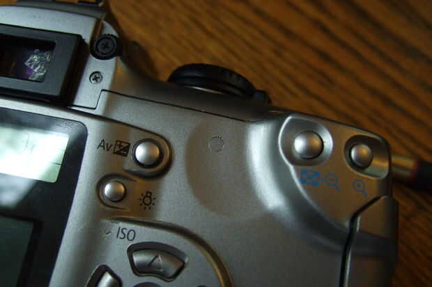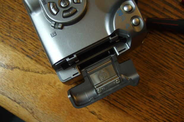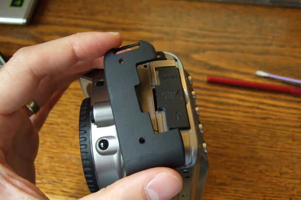 2-quitar gris tapón en la parte trasera de la cámara que cubre un tornillo y quitar el tornillo (Foto 1)