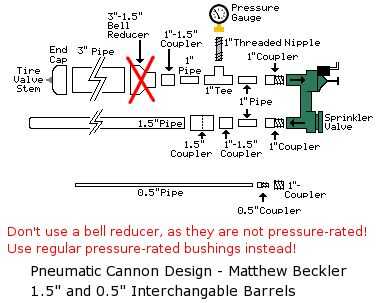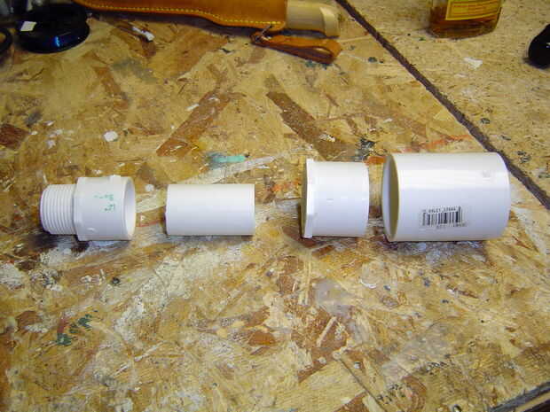 Una nota sobre la longitud de tubos: Las longitudes de la cámara de presión principal y barriles son hasta usted. El primer cañón que jamás construido utilicé tubos de 4' por tanto, que funcionó bastante bien, pero era un poco pesado y un poco largo. Ese cañón se rompió hace años, así que cuando reconstruye este cañón nuevo (que yo estoy documentando aquí), he elegido utilizar tubos más cortos. Utiliza una cámara de presión de 2' y cortar las barricas para ser unos 4" más largo que el extremo de la cámara de presión, cuando ambos están conectados a la válvula.