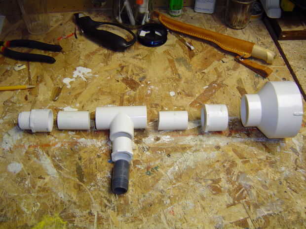 Alerta! Un lector astuto (bigbob12345) señaló que más acopladores del reductor de campana no son presión nominal. Por favor vaya a leer esta página en el wiki de spudfile. Se sugiere que en lugar de usar el reductor campana, que simplemente usar una serie de manguitos de presión clasificada regulares para conectar el tubo de 3" a la tubería de 1".