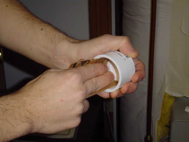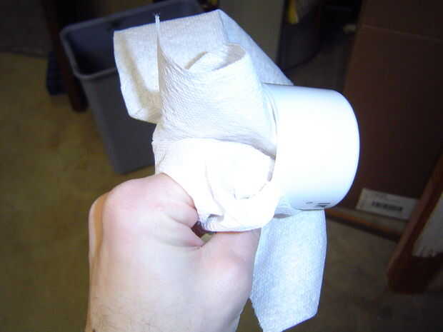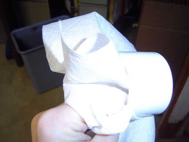 En algún lugar escuché que usted debe áspero a las superficies de unión con lija para aumentar la adherencia. Solía regular papel de lija áspero a ambos lados del enlace. Usted querrá obtener una toalla de papel húmeda para limpiar el polvo de PVC, que probablemente causa cáncer de pulmón, por lo que no respira. Para obtener una toalla de papel seco para secarlo las guarniciones.