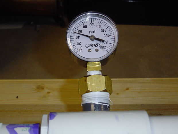 cuidadosamente llenaban mi cámara de presión. Comencé a 10 psi y poco a poco aumentó la presión con ráfagas cortas de mi compresor. Cargar la cámara a unos 65 psi y había queda solo por un tiempo. Cuando regresó 15 minutos después y tomó esta foto, la presión ha caído a cerca de 50 psi. Ya que casi nunca espere 15 minutos entre presurizar y disparar, esto no debería ser demasiado de un problema. Creo que es la fuga más grande de la unión entre el manómetro y el pezón de gris oscuro. No estoy muy seguro que tienen roscas compatibles. Durante la prueba de presión, puse una capa pesada sobre el compartimiento de presión, por si acaso. Ten cuidado.