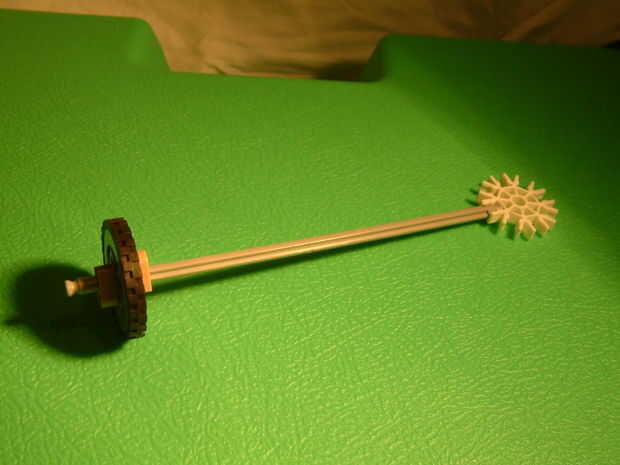 clip el clip tan en el extremo de la barra gris para que la barra pequeña del clip está apuntando hacia el resto de la varilla. luego deslice la rueda en modo clip tan está conectado a la rueda. luego coloque el otro clip tan a la barra pero en el lado opuesto a la otra pinza y así que se enfrenta a la rueda y conecta a la rueda. luego empuje la varilla a través de los orificios en las ruedas grandes en el barril y luego clip en el conector blanco al final. como abajo