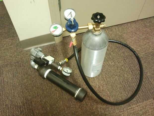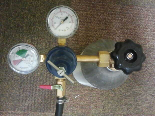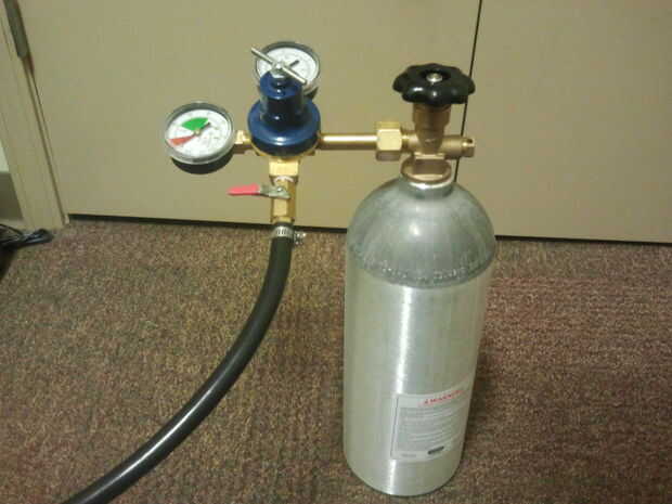 Armando el "relleno" no es muy difícil. Si su tanque viene con una válvula roscada ya (la mayoría si), asegúrese de que usted compra el regulador que empareja. El combo de cilindro y regulador que es comúnmente utilizado para elaboración de la cerveza casera para la presurización de los barriles. Después de llenar el tanque, solo hilo de rosca en el regulador, coloque la manguera, abrazaderas y conexión rápida y eres bueno para ir.
