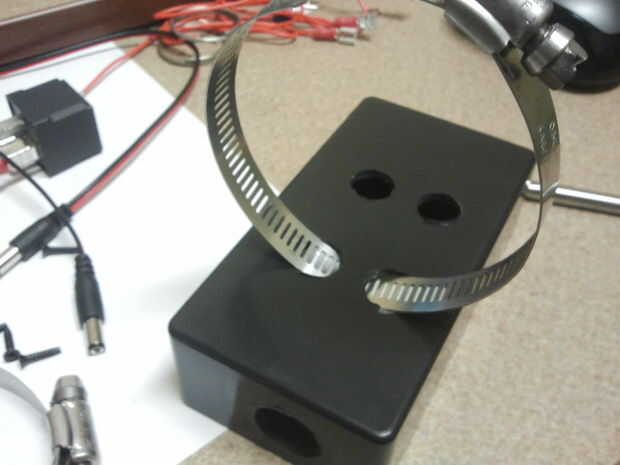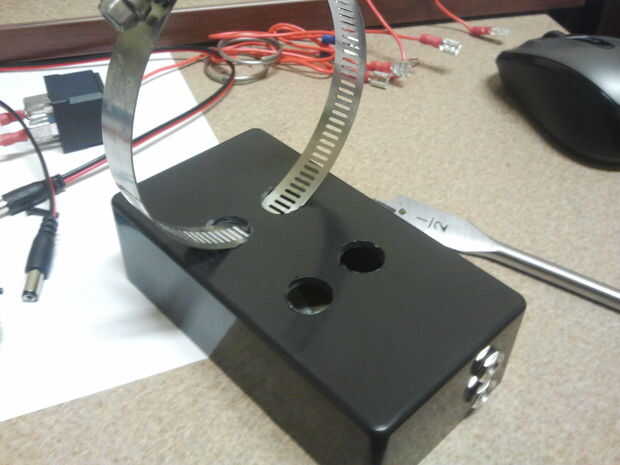 Para montar el cuadro de proyecto al cañón, perforé cuatro agujeros de 1/2" en un rectangular en la parte posterior de la caja que las abrazaderas de manguera a través y alrededor de una sección de la caja. Ver la imagen de los agujeros y espaciado parecía. Gratis entregué mis agujeros puesto que realmente no tienen que ser eso exacto. Asegúrese de que forman un rectángulo terminado (o de lo contrario la caja va a quedar torcido cuando el lanzador). Usted necesita para hacer los agujeros espaciados lo suficientemente para adaptarse a la curvatura "natural" de las abrazaderas de manguera y las abrazaderas todavía necesitan estar bajo un poco de tensión una vez en el lugar. La manguera Abrazaderas utilizadas son 2 1/2" abrazaderas. Encajan muy bien alrededor de la boquilla de 2"(cámara secundaria) y de esta consola.