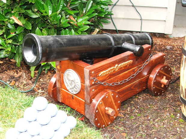 Teñido de la madera y añade algunos cadena negro y algunos moldean de madera detalle en casa encontré Depot para dar el cañón alguna decoración fantasiosa. También encontré una cabeza de pirata resina moldeada en un cubo de descuento en alguna parte que creo que fue pensado originalmente como un kit de hebilla de cinturón de pintura usted mismo. No muestra muy bien en la foto, pero había pintado bronce y había añadido como un emblema de bronce fundido en la parte delantera.