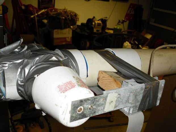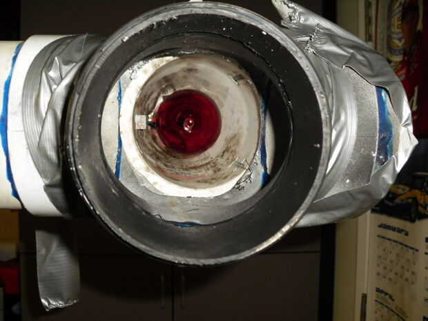 Los materiales que usted necesitará para esta parte del proyecto es de 5 luminarias 5 bulbos rojos, instalación eléctrica, un taladro, 4" Sierra del agujero y cinta aislante. empezar por taladrar un agujero en la parte posterior de cada uno de los cañones en la parte posterior de las articulaciones con la sierra. luego de alambre los cinco artefactos de iluminación juntos todos en un circuito y un enchufe conectado a tierra' en' a un extremo de la instalación del empalme. entonces pato cinta cada artefacto al cuerpo de la configuración con la luz hacia dentro. Si usted elige los mismo accesorios en la imagen a continuación, puede que necesite espacio de la caja de la lámpara de la PVC, se utilizó una 2 "x 4" para empujar lejos y mantenerlo incluso.