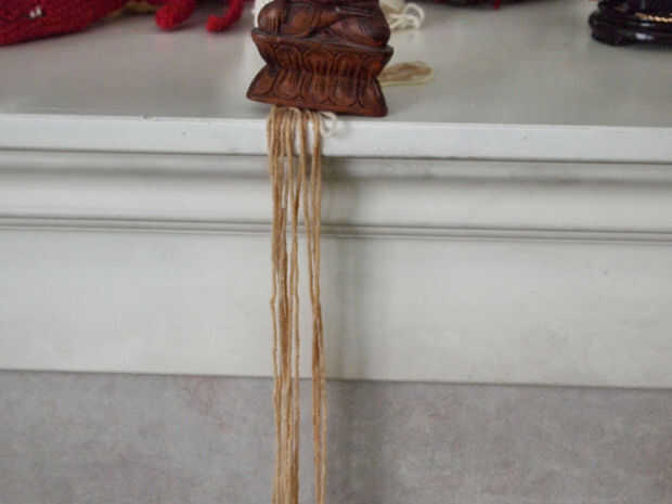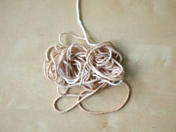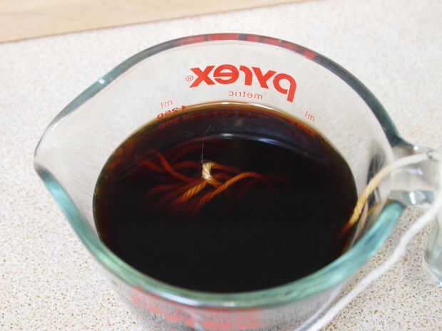 Primero lo que hice fue determinar cuanto hilo necesito para teñir, hacer así que parte del cuerpo de ganchillo y luego desmantelado para medir la longitud, ft ~ 8 o 240cm. He seguido intructable de iamkeebler sobre cómo teñir el hilado con el café. Primero lo remojo de media y horas en vinagre diluido, luego preparar un café muy fuerte y empapar el hilo en ella. Quería producir un gradiente de color en mi hilo, por lo que me tira un poco de la lana en el tinte cada dos horas o menos (no despierta en plena noche para hacerlo sin embargo). Al día siguiente me había aclarado el hilo suavemente con jabón y agua y colgar para secar.
