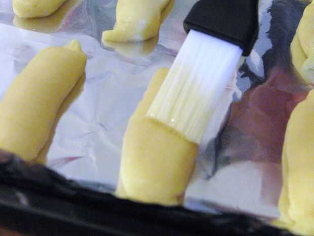 Uso lavan el pincel de repostería o cuchara y cepillo el huevo encima los canutillos. No te preocupes si tienes huevo sobrantes. Después de su preparación hacer los eclairs, poner en el horno y hornee a 350 grados Fahrenheit por 30 minutos. No abrir el horno mientras se hornean los eclairs. Esto podría provocar que los canutillos no aumente. Usted puede hacer furtivamente una ojeada cerca del final del tiempo de cocción. Usted sabrá cuando los éclairs se hacen cuando los canutillos estén dorados y aparentan estar secas.