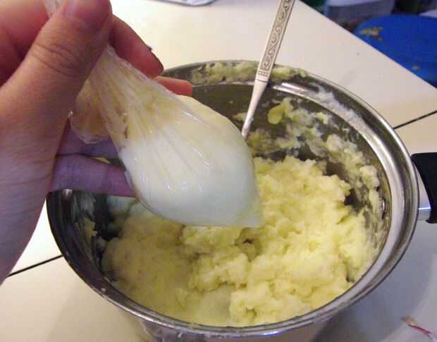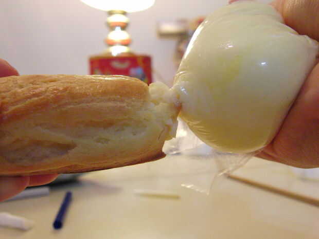 Primero usé un palo para haga un orificio en el extremo de la religiosa al horno. Luego llena una bolsa de plástico con la crema de calabaza y canaliza el relleno en el centro hueco.