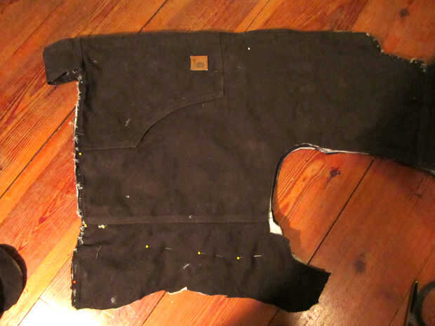 Empecé poniendo la chaqueta de miel con la cremallera en la espalda y el pecho a las dimensiones correctas de clavos. Una vez hecho esto he quitado la chaqueta y doblado a lo largo de la cremallera, corte 1/2" más allá de las marcas fijadas. Yo entonces cubrió el pecho juntos como sería ser cosido por lo que pude ver cómo se forma y ponerla en miel.
