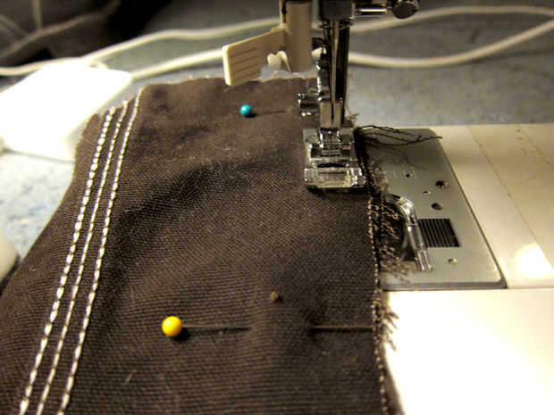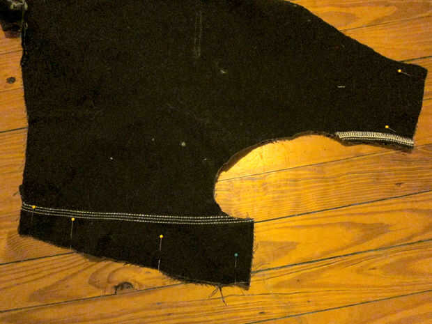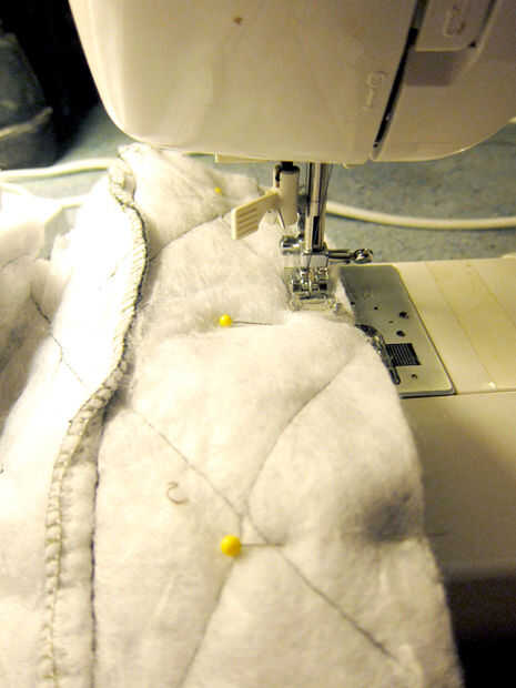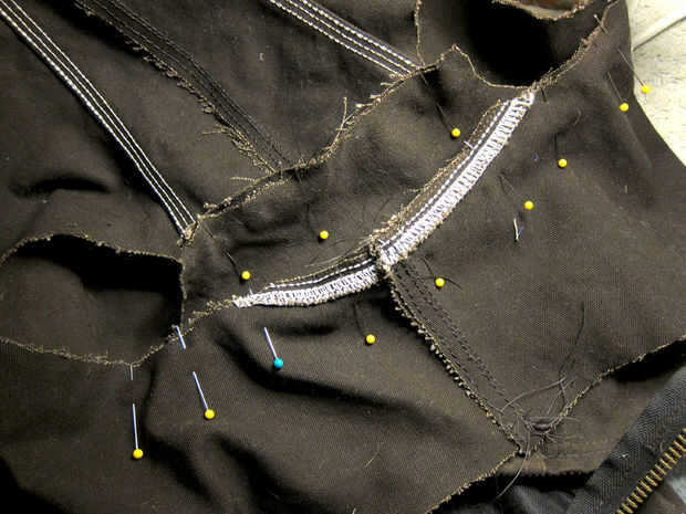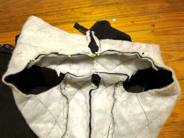 Ahora, la capa de Carhartt tenía una guarnición ya cosida en él. Estas dos telas pegan y así fueron cortadas hacia fuera al mismo tiempo como estaba cubriendo la capa. Cada vez que te digo a coser juntos una parte de la capa, recuerda que tienes también coser la parte correspondiente de la guarnición Junta.
