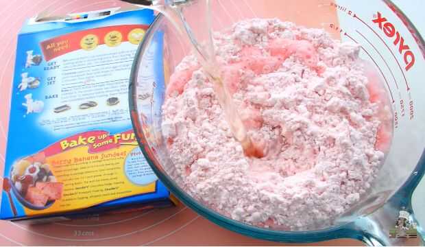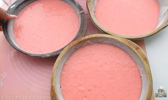 Preparar la mezcla para pastel como se indica en el cuadro. División entre los tres moldes y hornear a 350 grados durante 20-25 minutos.