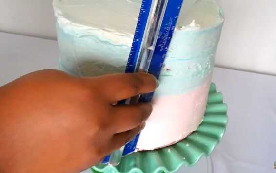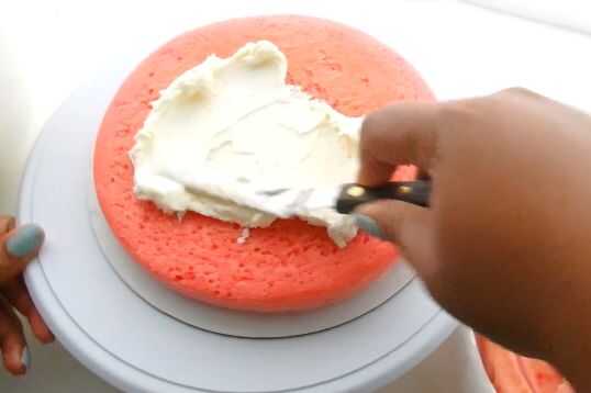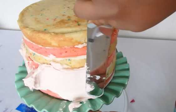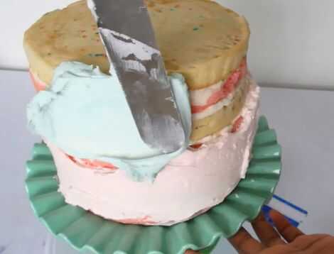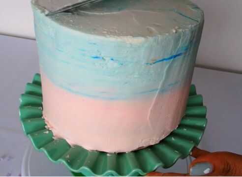 Con una espátula untar la mitad de la torta rosa y mitad azul. También cubre la parte superior de la crema de mantequilla. Utilizar una regla o raspador de gran tarta para crear una superficie lisa para la torta y los dos colores se mezclan.