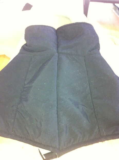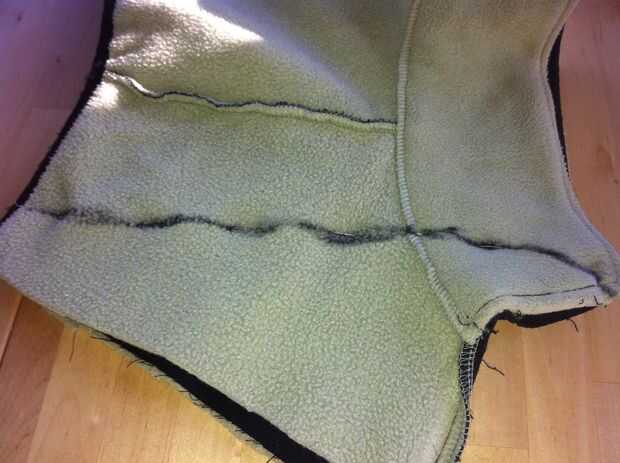 Me tomaron el chaleco recortado a la máquina de coser fiel y voltea el material de adentro hacia fuera. Entonces, trazó un arco con un marcador de la tela que yo pude coser para asegurar la parte frontal de la capa. Con el material totalmente adentro hacia fuera y doblado por la mitad para poner el plano, coser una costura siguiendo el arco, asegurar ambos extremos con un simple atrás y adelante de la puntada. (ver imagen 2)
