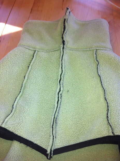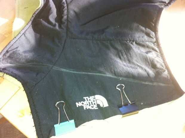 Traer algunos clips binder para garantizar la colocación (no usar alfileres rectos aquí... Si uno pegado Klaus habría saltó en el lugar!), y ponen el chaleco sobre tu perro.