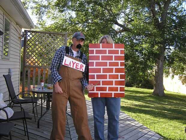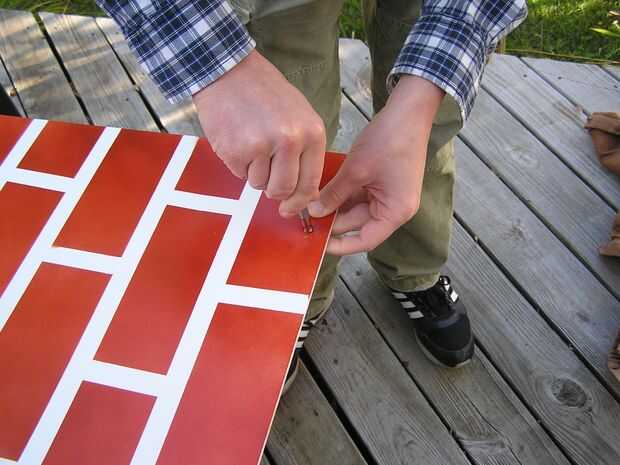 En cuarto lugar, cuando la pintura esté seca, rasgar la cinta azul. Tomar el destornillador y hacer dos agujeros en la parte superior de la Junta de espuma. Poner la cadena a través de un agujero y hacer un nudo. Deje suficiente espacio para la cadena a ir alrededor de su cuello y luego coloque el extremo de la cadena a través del otro agujero y lo nudo. Es el traje de ladrillo.