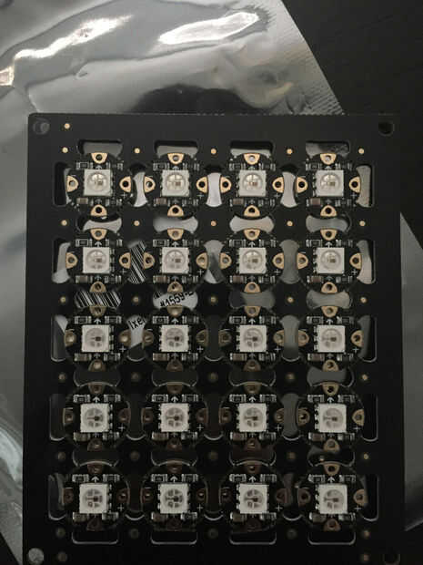 Un par de semanas atrás, me di cuenta que el orificio de mi soporte de monitor en el trabajo es casi exactamente el mismo diámetro que un anillo de 24 NeoPixels que yo tenía por ahí. La parte posterior del monitor enfrenta a varios compañeros de trab