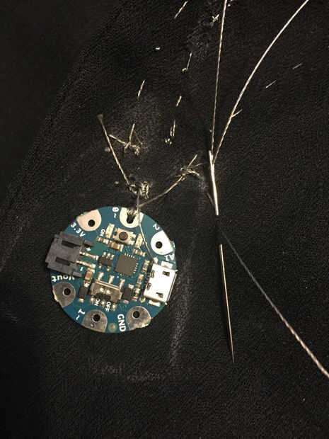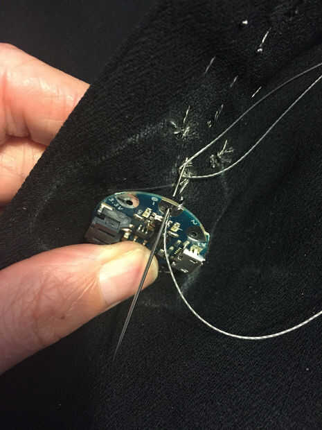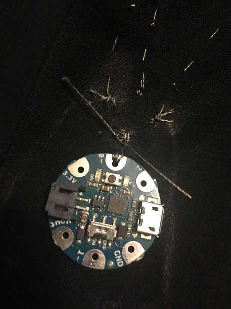 En esta sección, se conecte la Gemma del primer píxel utilizando hilo conductor y asegúrese de que tenemos un gran punto para la batería. Nuestra vida de la batería en un interior juego pocket y necesitaba una buena manera de pasarlo a través de, por lo que hemos añadido un botón que empareja del agujero a la chaqueta!