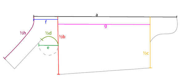 Desde el extremo del cuello, línea siguiente a, mida la longitud de f (cuello a la parte posterior de la pierna delantera) y otra vez hacer una marca. De esta marca en la tapa, Mida hacia abajo la mitad de la longitud de b (circunferencia del pecho) y marque toda la línea de.