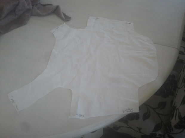 Ahora debería tener algo tratando como el cuadro dibujado sobre la tela de su maqueta. En el extremo de las aletas del cuello y del vientre debe agregar por lo menos 2 pulgadas de la costura, así que tienes que pegar las agujas en cuando usted está tratando a su perro y al mismo tiempo que tienes tela extra para facilitar en el patrón, si no cabe la primera vez.