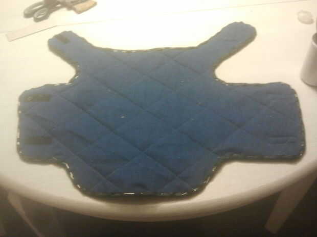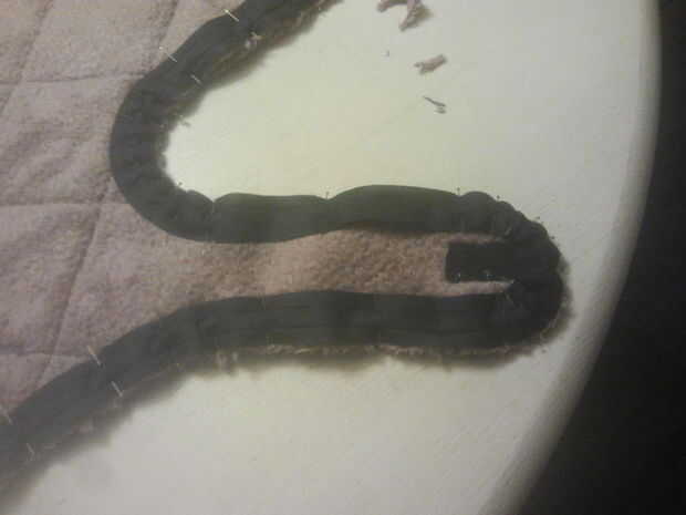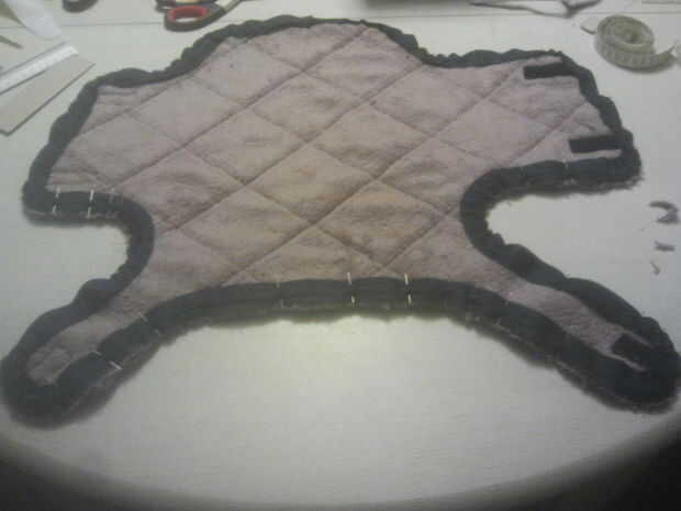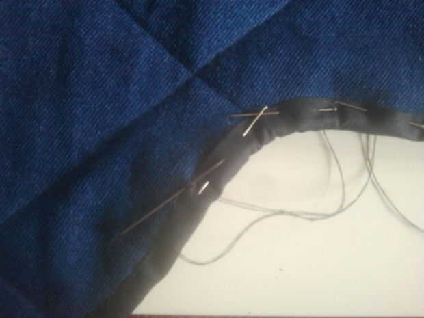 Ahora las aristas deben ser acabados. Ronda de todas las esquinas de la capa, como hará más fácil trabajar con y, creo, es más atractivo a la vista. en el lado del forro de la capa, comienzan a prender la cinta hasta el borde, a partir del extremo de la cola. En las curvas donde el borde exterior es más de donde coser, debe comprimir un poco más de cinta de bies, por lo que fácilmente cubrir el borde cuando la vuelta. Por otra parte, en las curvas donde el borde es más corto, la cinta debe estirar un poco, así que no meta cuando dio la vuelta. Cuando todos los bordes se cubrió con cinta de bies, coser en su lugar y retire los pasadores. Corte un poco los bordes y la cinta de bies, así quitando algunos de la mayor parte bajo la orientación y facilitar el rodaje de la cinta. Vuelta la cinta y pasador en su lugar. Yo personalmente prefiero coser el último bit en lugar con la mano, como creo que puedo hacerlo mejor en mano que a máquina y es lo que hay una foto, pero si eres perezoso o muy bien con una máquina, utilizarla, ahorra tiempo.
