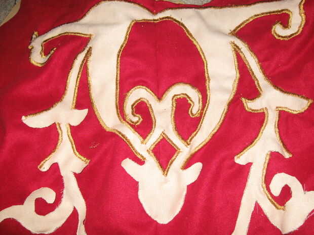 Esta parte se llama stitchappliqué raso.  Para los que no saben, esta es una puntada zig-zag muy cerca que se sujeta una pieza de tela a otro. Observe que cada línea debe estar cosido dos a tres veces para hacer agradable y limpia, sin huecos.  Asegúrese de que practiques antes de apliques en tu manto.