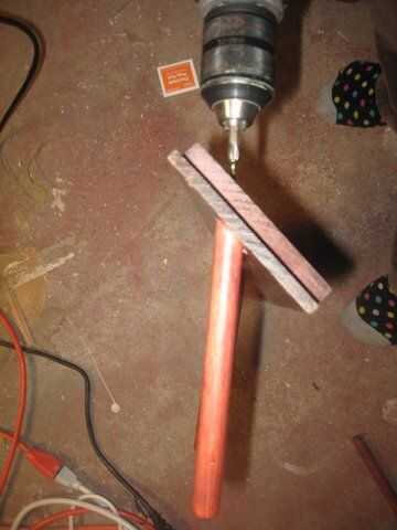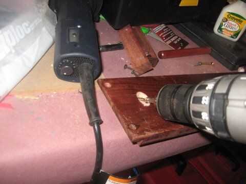 Tomar un tornillo y tornillo en la junta la forma de la clavija se atraviese, hasta usted sólo empujar hacia fuera en el otro lado. Esto le da su marca de donde insertar las clavijas. Quite el tornillo. Añadir un poco de pegamento, jam la peg en y enroscar desde atrás. Utilice las clavijas que eran chatarra después de cortar las espigas de la manopla de la parrilla. Trate de alinear para que el taladro, el tornillo y el pasador, hacen una línea recta.