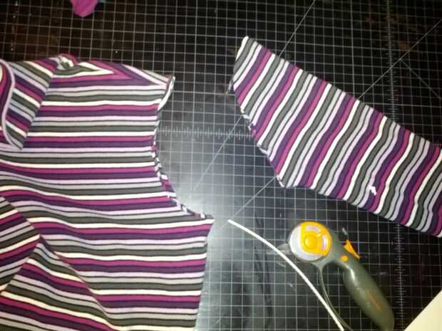 Cortar cada manga en la costura de la sisa - esto es más o menos simétrica, así no tienes que darle el tratamiento de orificio del cuello, sólo la rebanada con una lámina rotatoria o corte con unas tijeras en la costura, mientras que el suéter es acostado.