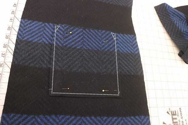 ►Place bolsillo en el lado derecho del frente, alineando las marcas. PIN y coser 1/4" de borde, hacer un ángulo recto en la parte superior, esto refuerza las esquinas del bolsillo y ayuda a prevenir daños por desgaste.