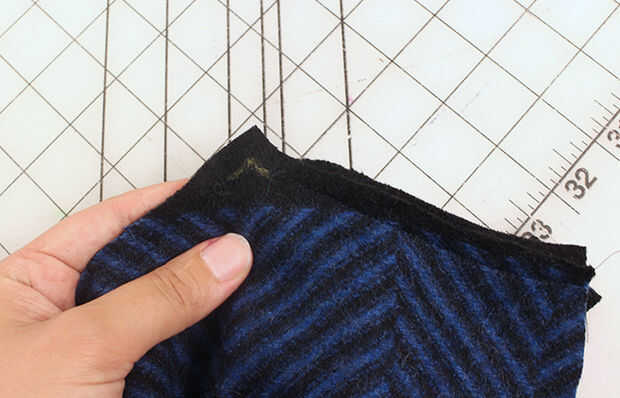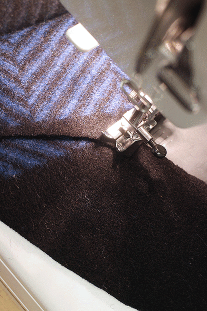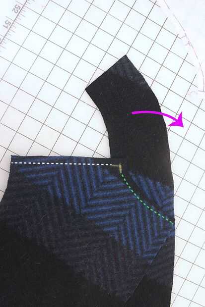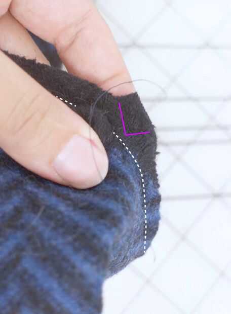 ► Coser el hombro desde el exterior que va hacia el cuello y terminando con la aguja hacia abajo a través de la tela sobre la marca.