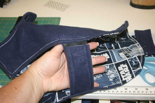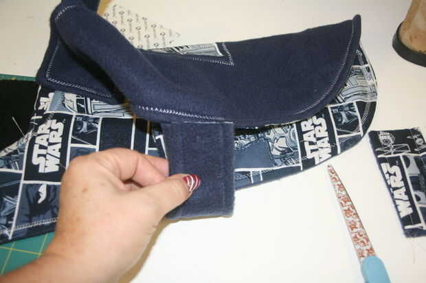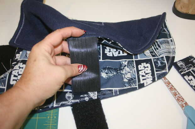 En este punto usted tendrá que poner la capa sobre el perro para obtener una colocación exacta para el cierre de Velcro.