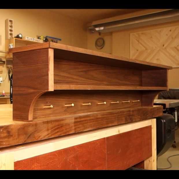 Esto fue hecha de cierta izquierda sobre pedazos de 3/4" madera contrachapada de nogal tenía de un proyecto anterior así que estaba trabajando con ciertas limitaciones. Los "ganchos" están hechos de varilla de latón de 1/2". Te haz montado en la pared con tarugos y tornillos de latón.