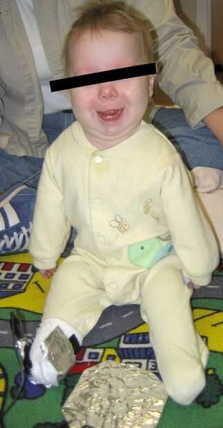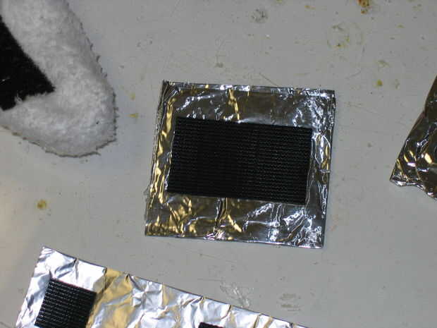 También tuvo sus calcetines suaves / botitas de bebé y cosido en el lado del lazo de un pedazo de velcro a la media. Somos caliente-pegado el lado del gancho del velcro a una tira de papel de aluminio que había sido doblado sobre un par de veces. Esto hizo posible una amplia variedad de ajustes y nos ha permitido experimentar con un montón de diferentes configuraciones.