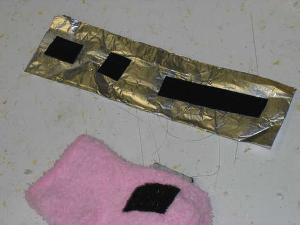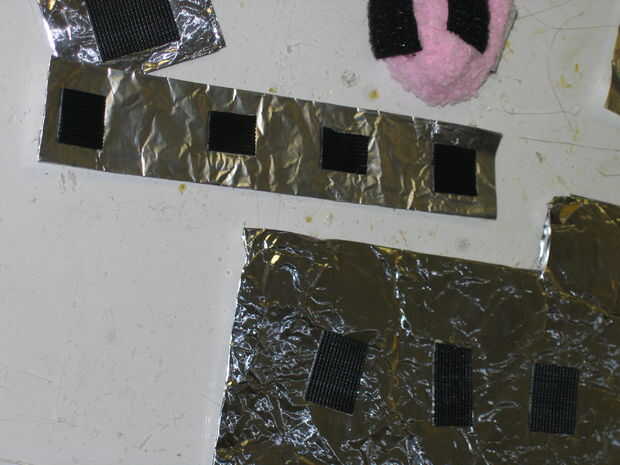 En primer lugar, hicimos un cojín (como en la cañería instructable). A continuación, había cubierto uno de sus zapatitos con pegamento caliente y entonces cubierto en papel de aluminio. Un clip va a la almohadilla, el otro a la zapata. Ella podía activar juguetes pateando su pie contra la placa.